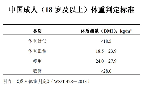 根據(jù)中國18 歲及以上成人 BMI 評判標準,我國健康成年人的BMI 正常范圍為 18.5kg/m2≤BMI<24.0kg/m2,BMI<18.5kg/m2為體重過低,24.0kg/m2≤BMI<28.0kg/m2為超重,BMI≥28.0kg/m2為肥胖。脂肪在腹部蓄積過多稱為中心型肥胖,可根據(jù)腰圍直接判定。