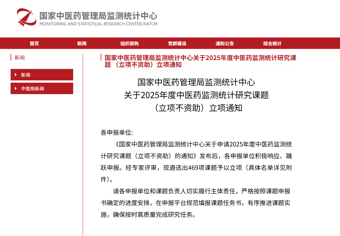 近日,國家中醫(yī)藥管理局監(jiān)測統(tǒng)計中心發(fā)布了《國家中醫(yī)藥管理局監(jiān)測統(tǒng)計中心關于2025年度中醫(yī)藥監(jiān)測統(tǒng)計研究課題(立項不資助)立項通知》。東華原申報的4項課題通過審批,成功立項。